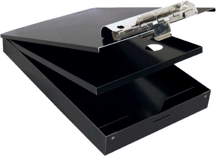 • Hinged writing plate conceals documents and prevents write through multi-part forms