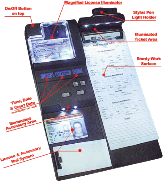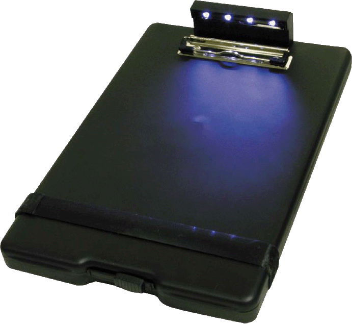 Elliminate the need for dome lights or flashlights when out in the field. This clipboard also includes rechargable lithium batteries that are maximized by a 10 minute auto shut off feature, and the rail system which allows for additional accessories such as figerprint pad, calculator or magnifier to be attatched
